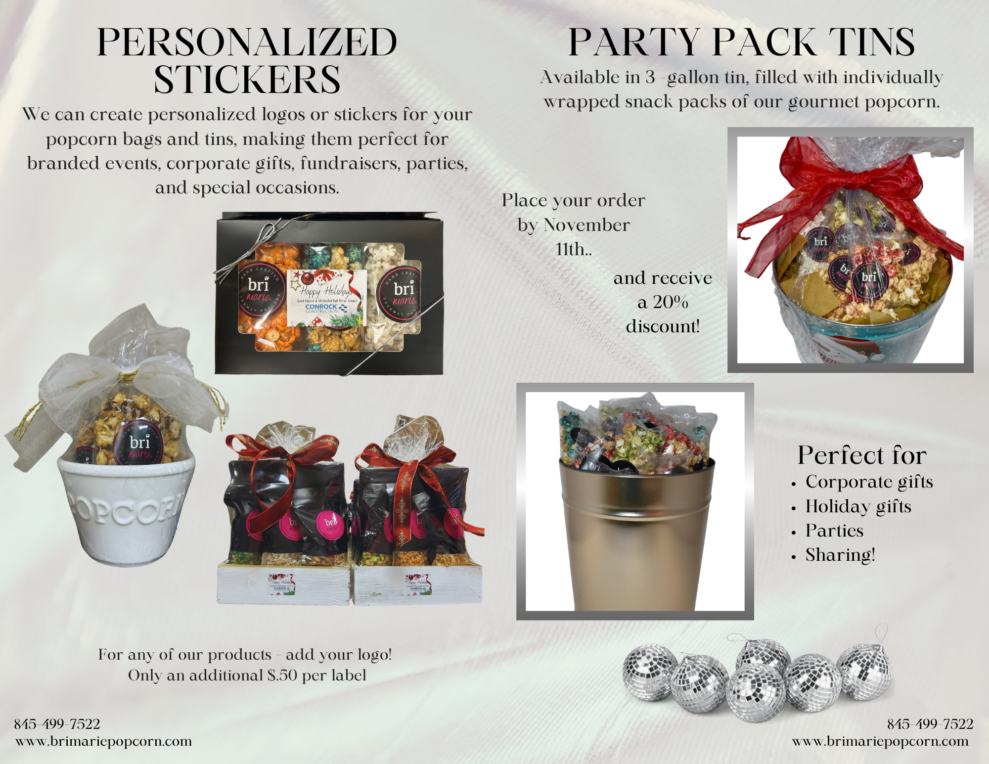 What sets Bri Marie Gourmet Popcorn apart is our dedication to craftsmanship and attention to detail. Each handmade batch of popcorn is carefully prepared to ensure optimal flavor and texture. Whether you order our popcorn for personal enjoyment or as a gift, you can expect a consistently outstanding product.