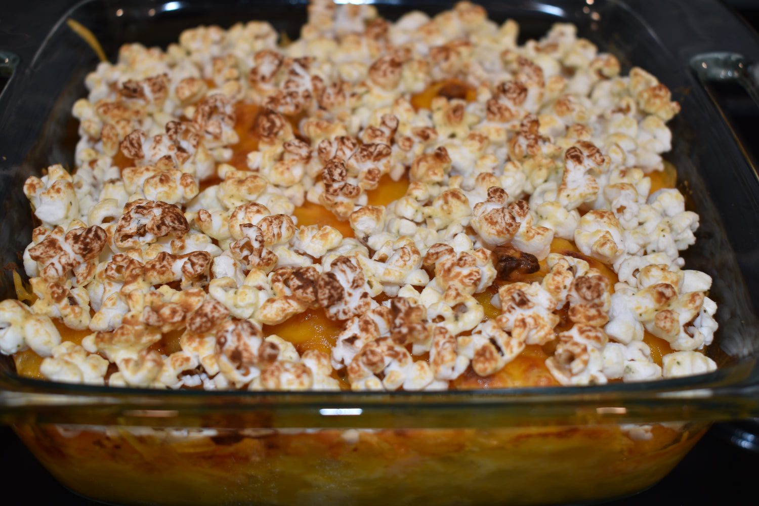 Step 7: After about 30 minutes, take your mac and cheese out from the oven and add a thin layer of Bri Marie White Cheddar Jalapeño popcorn on top, evenly.