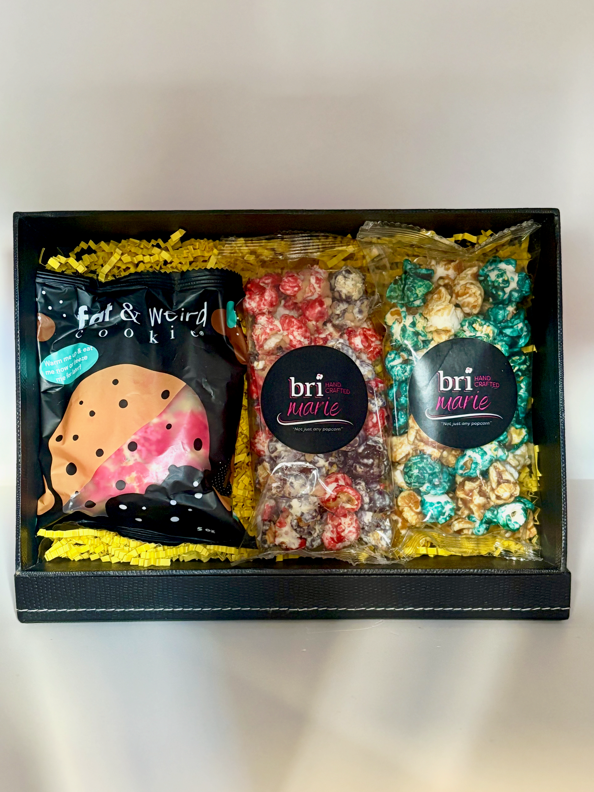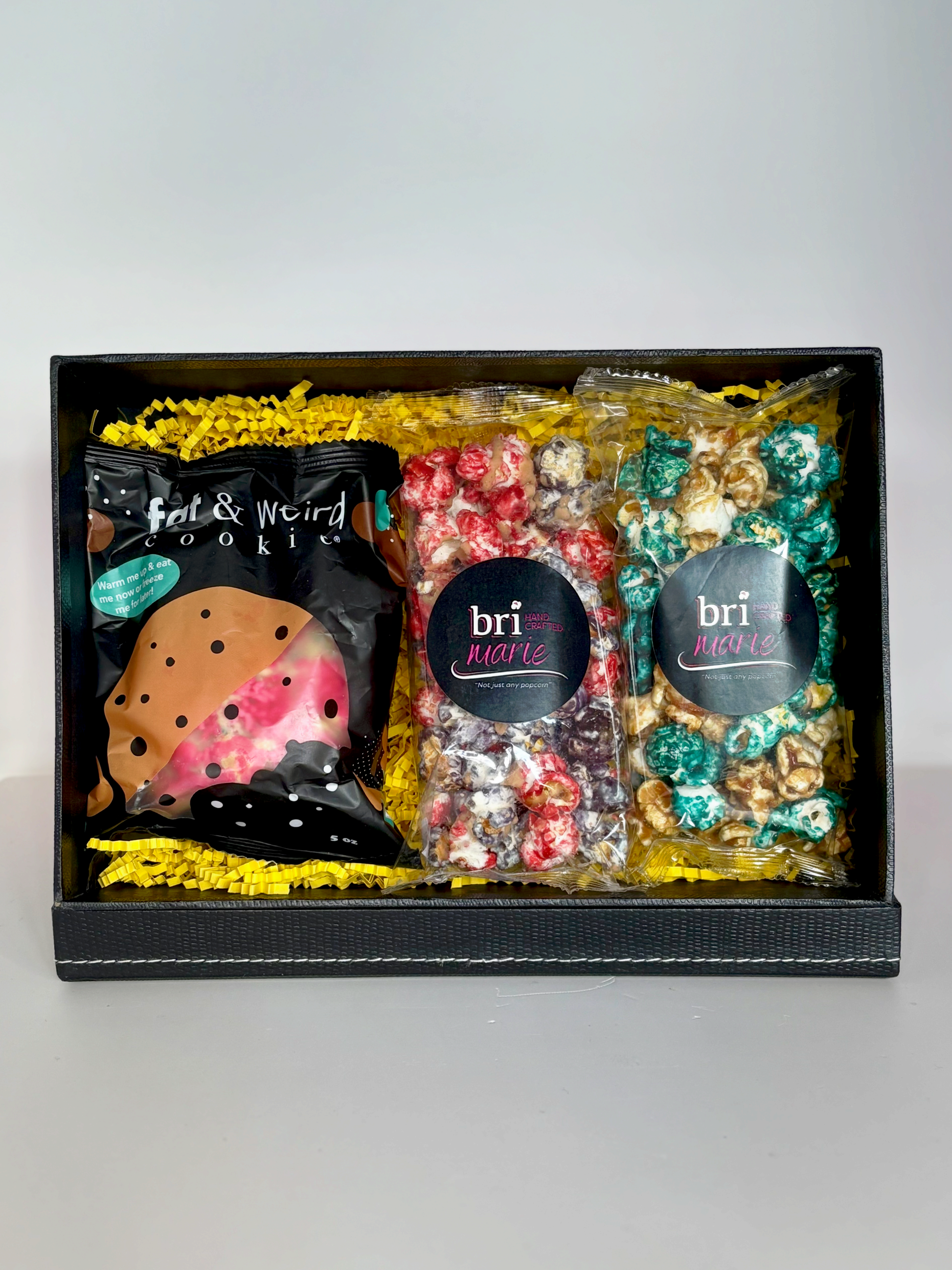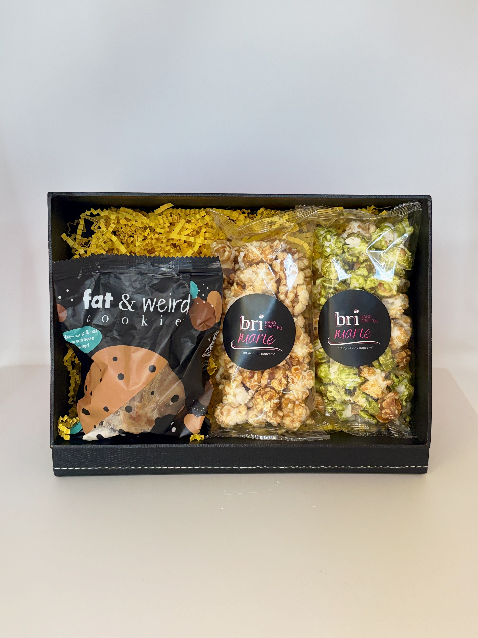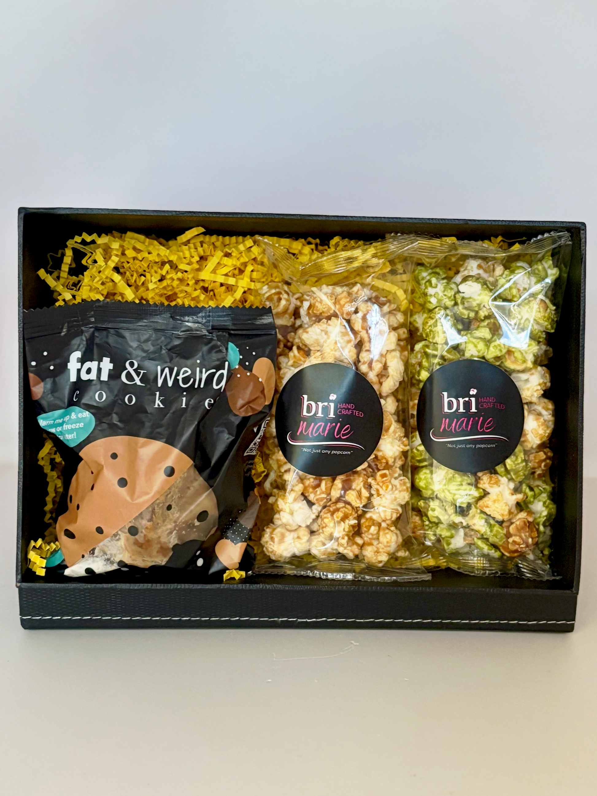 A gift made for true snack lovers. This premium leather gift box pairs the best of both worlds. Featuring one indulgent Fat & Weird cookie and two Bri Marie Gourmet Popcorn snack packs. Perfectly packaged for gifting, sharing, or treating yourself!