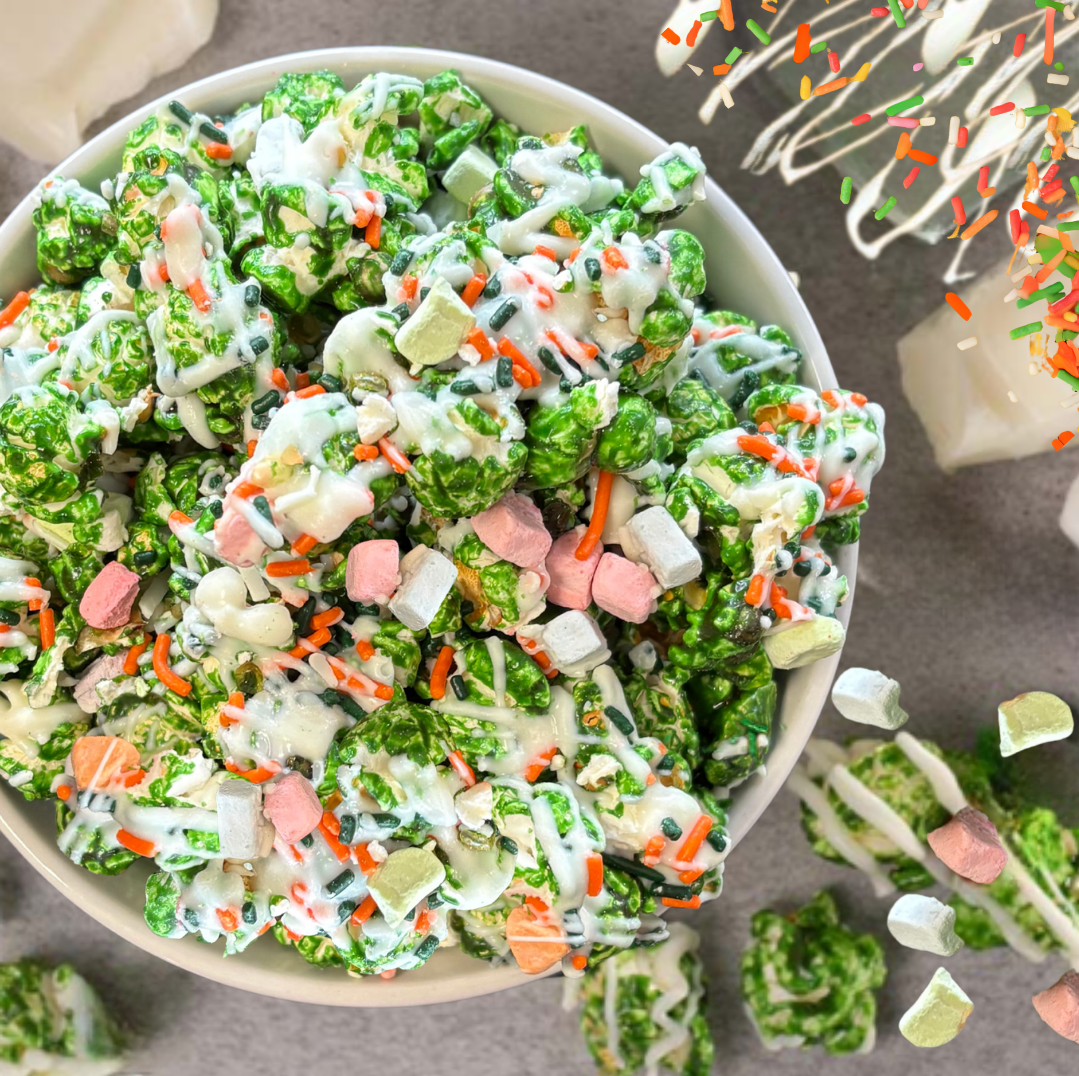 This festive blend features our signature vanilla flavored green popcorn drizzled with creamy white chocolate and sprinkled with lucky green and orange sprinkles and freeze dried marshmallows. A little sweet, a little crunchy, and a whole lot of magic. Perfect for catching leprechauns or simply enjoying the luck of the Irish!